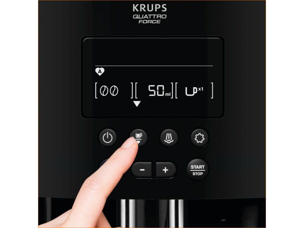 Systém Krups Quattro Force zaručí o 20 % rychlejší mletí a hydraulické pěchování. Součástí je také kompaktní spařovací jednotka a automatické čištění pro dlouhotrvající výkon.
